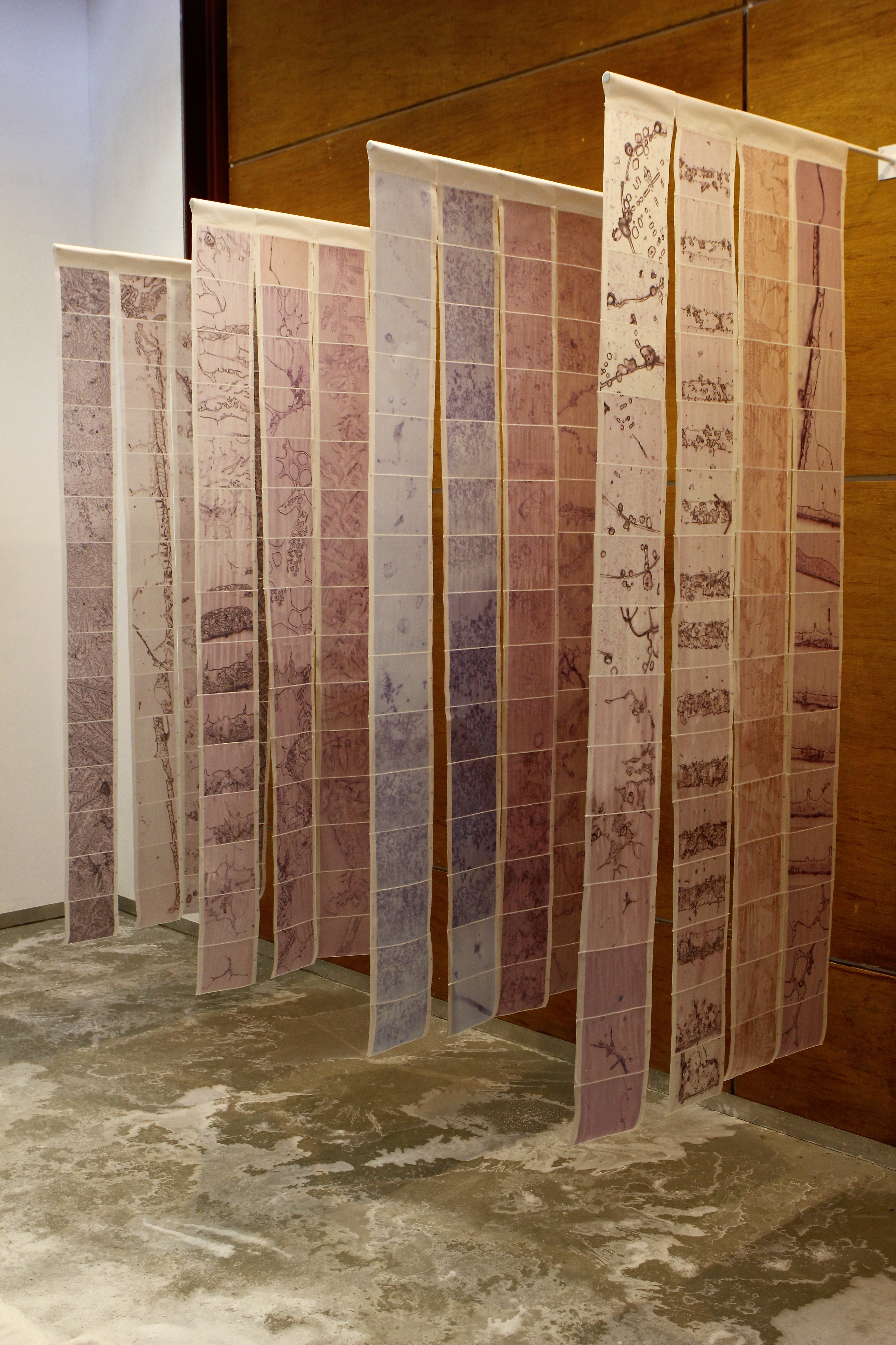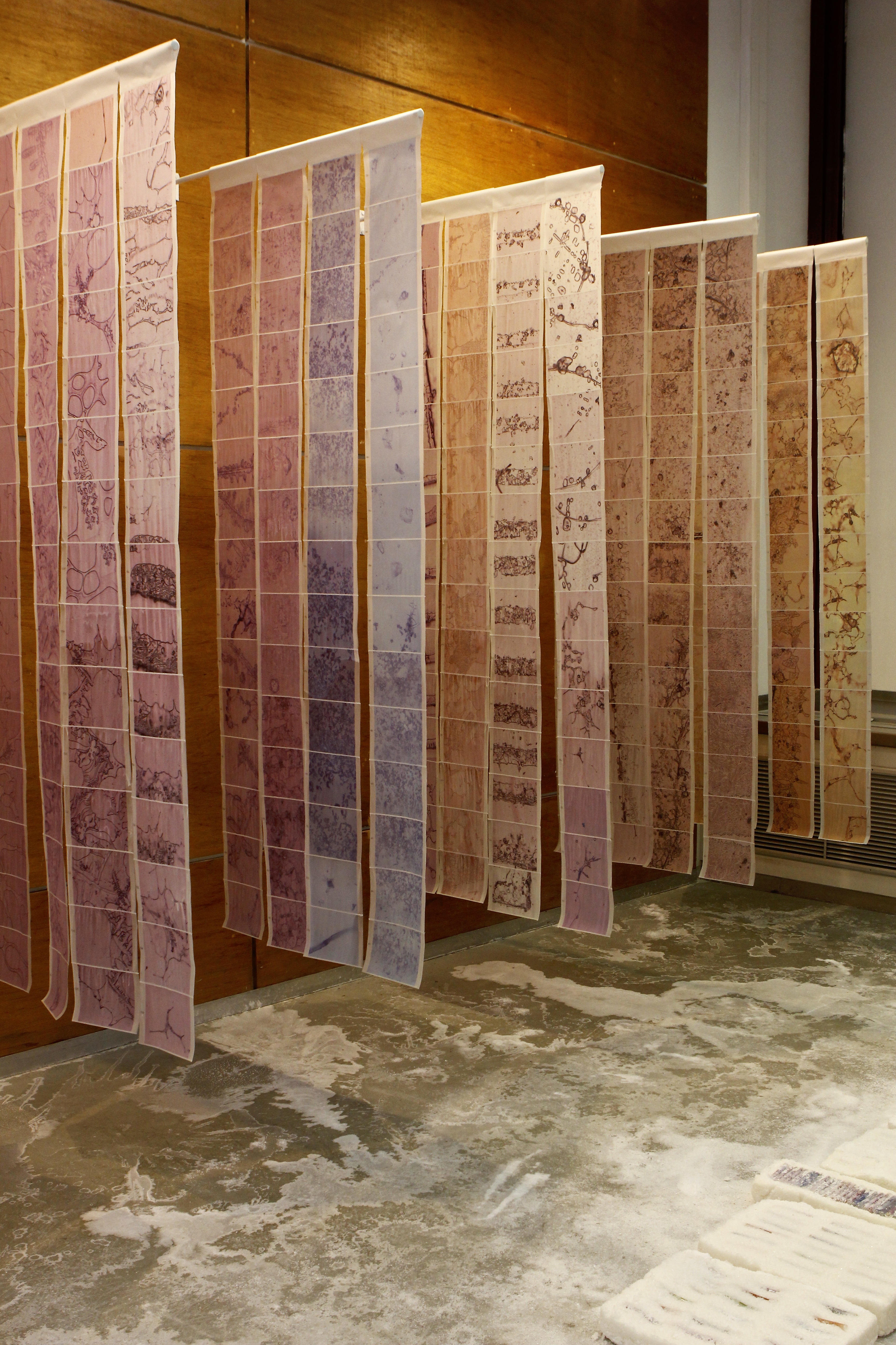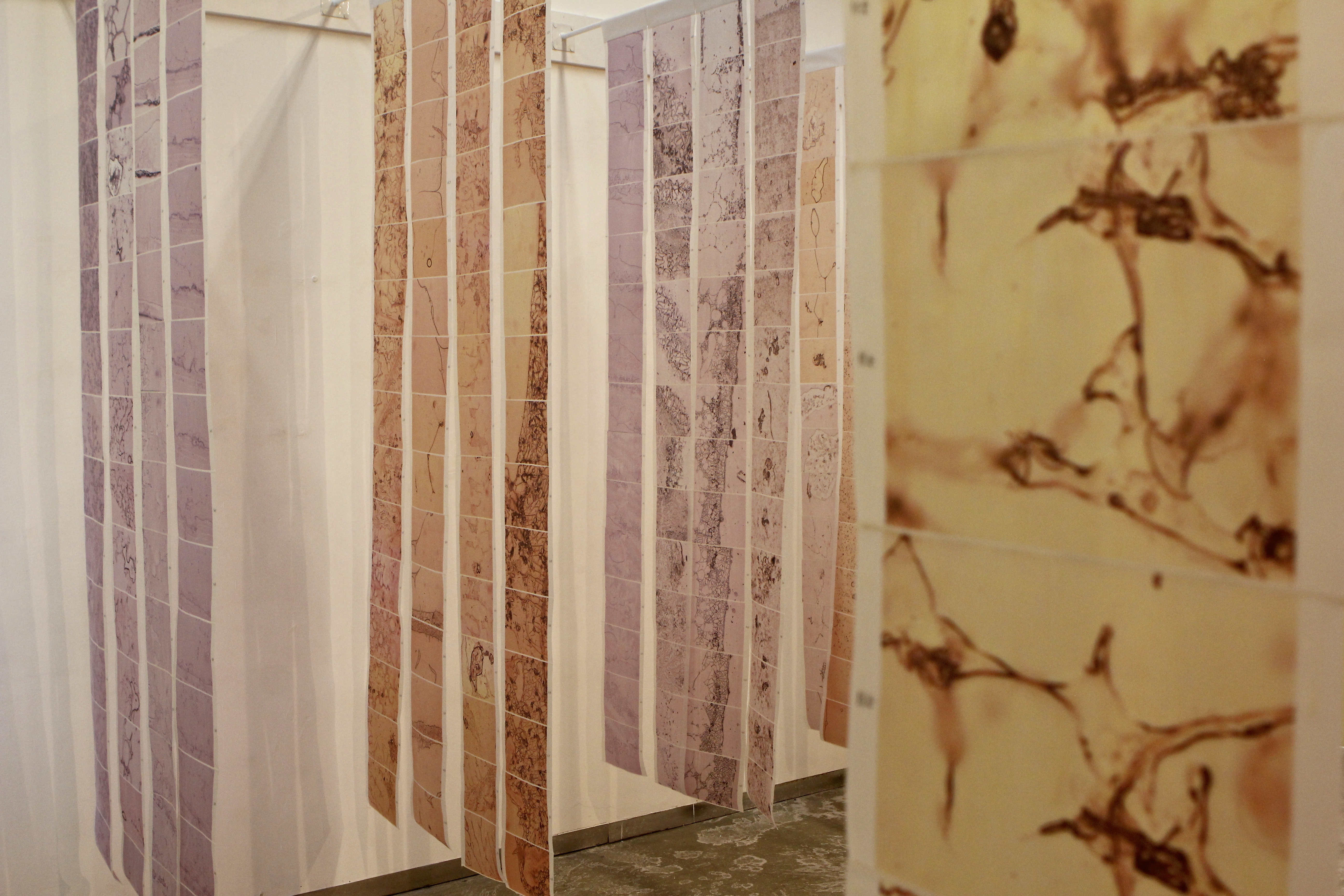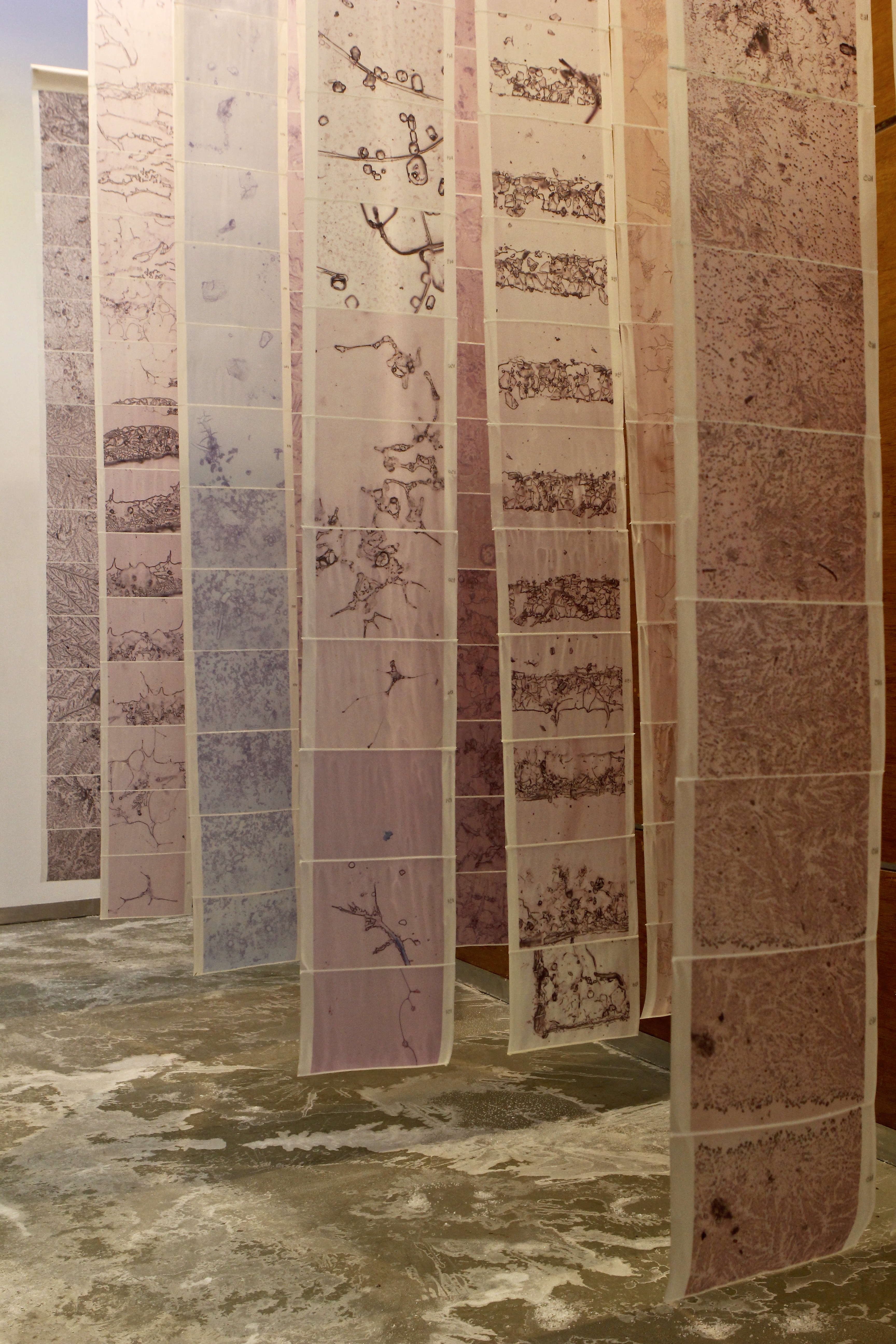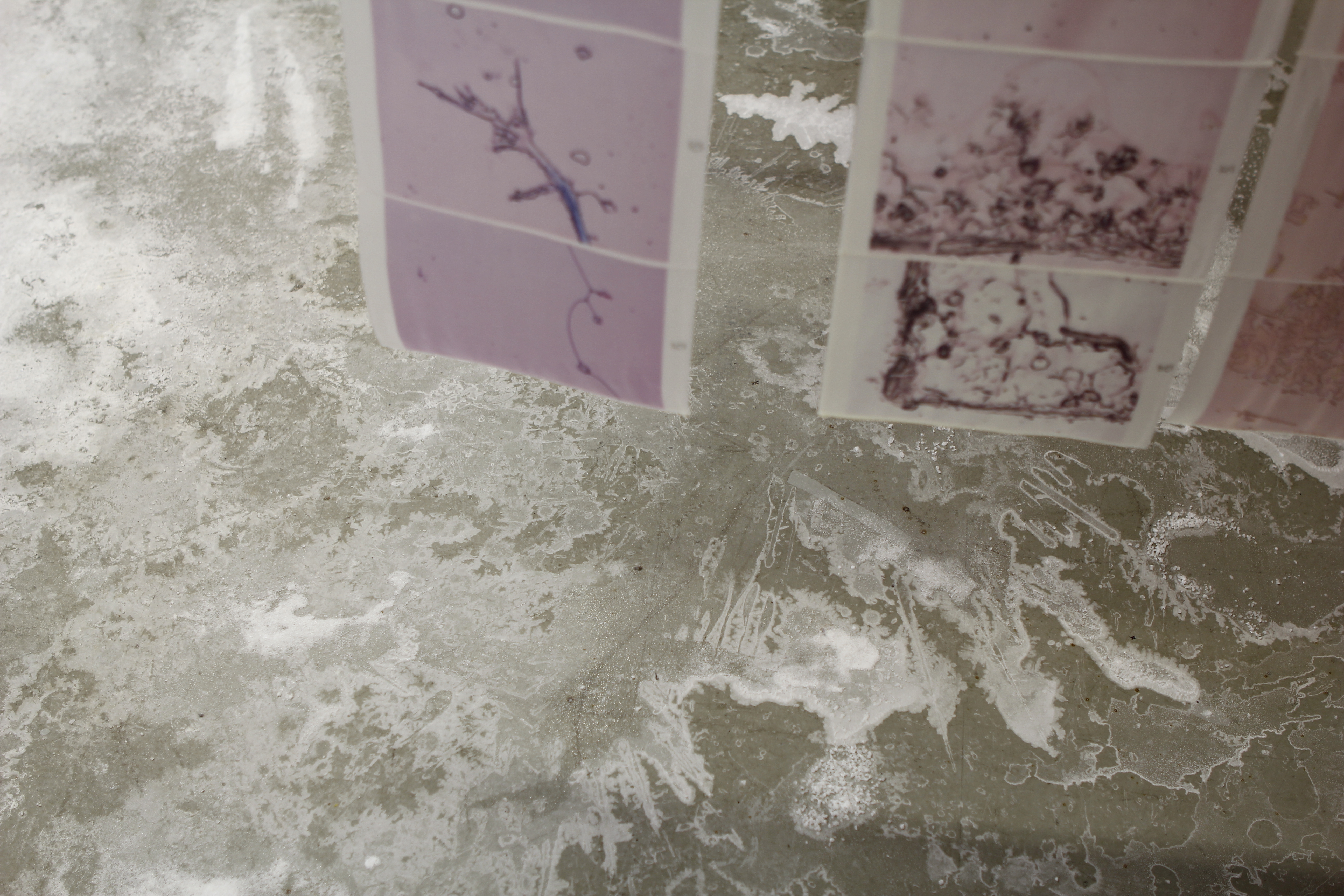 The project is an installation in the laboratory space at the MET. It consists of twelve drapes of photographs of tears under a microscope, plates of salt with hidden tear samples in them, salt on the floor, and glass boxes containing test tubes with photographs of tears. My alternative file emphasizes the fragment. It is a combination of diverse emotions of different people of different identities, at different times. It is an attempt to connect feelings, in an age that moves away from feeling and freezes it. I made use of photographs and on each one of them I wrote with pencil the number of the tear sample I was receiving. I waxed each photograph giving flesh to the intangible evaporated tear, an evidence of an emotions that has ceased to exist.