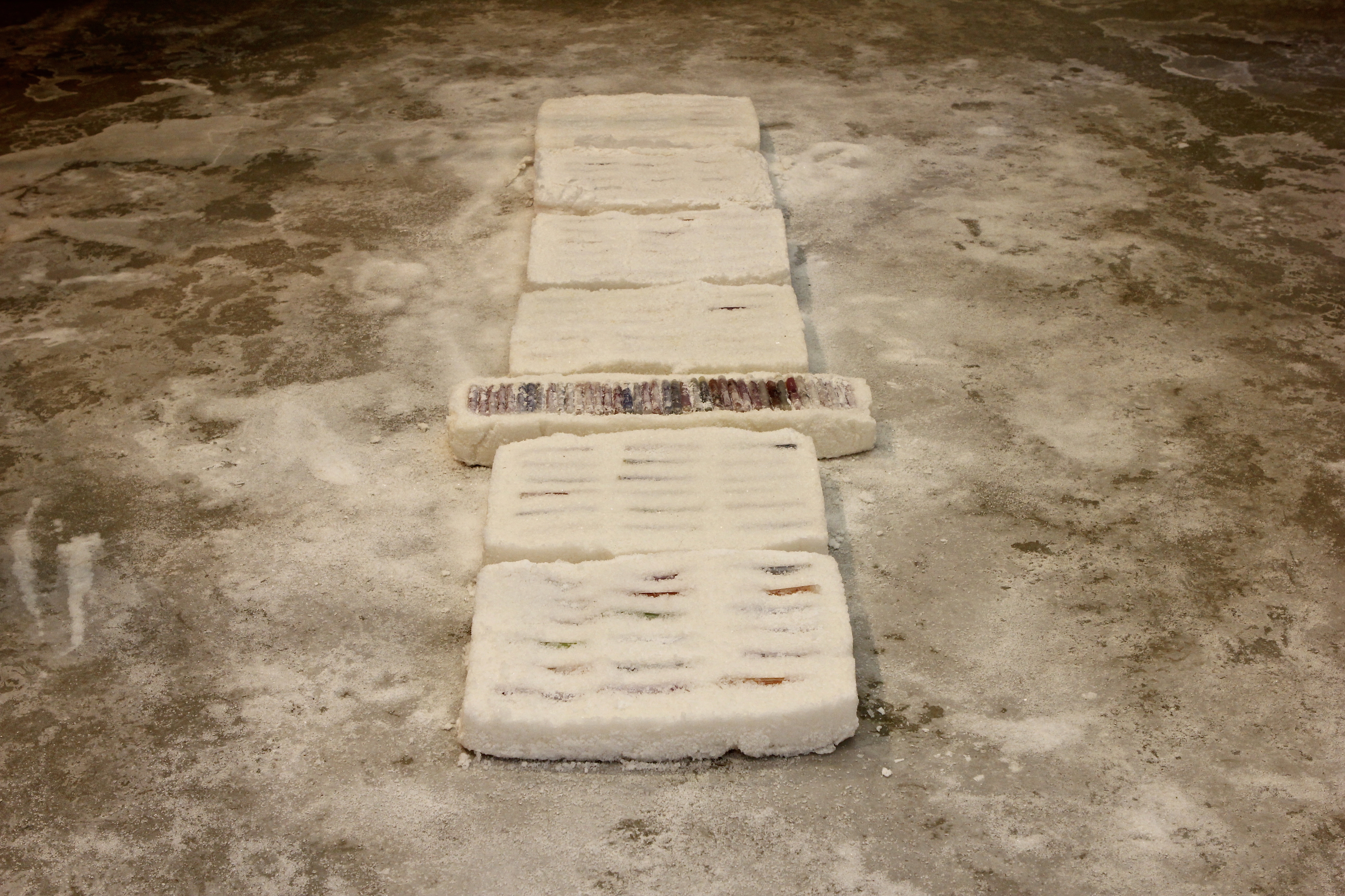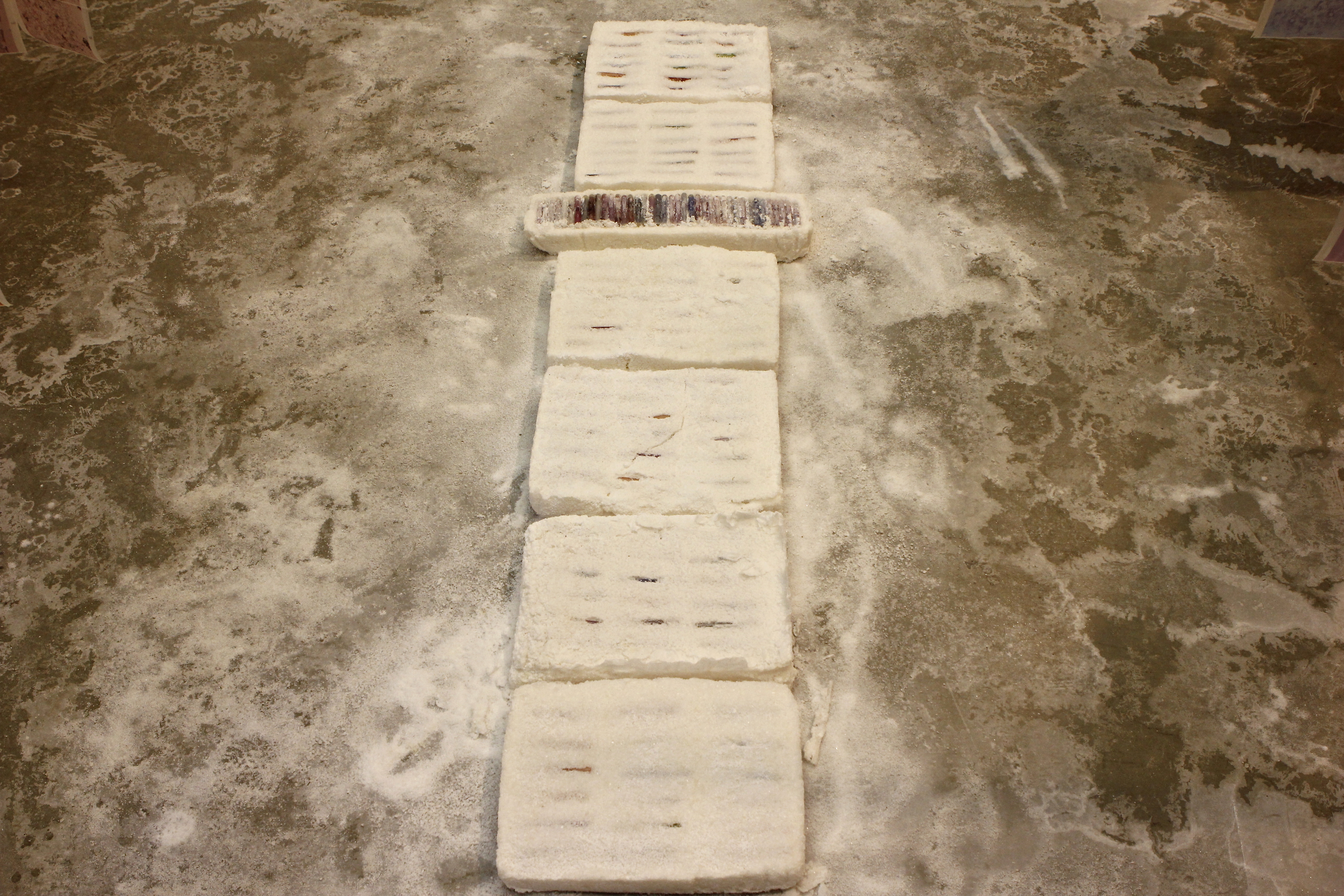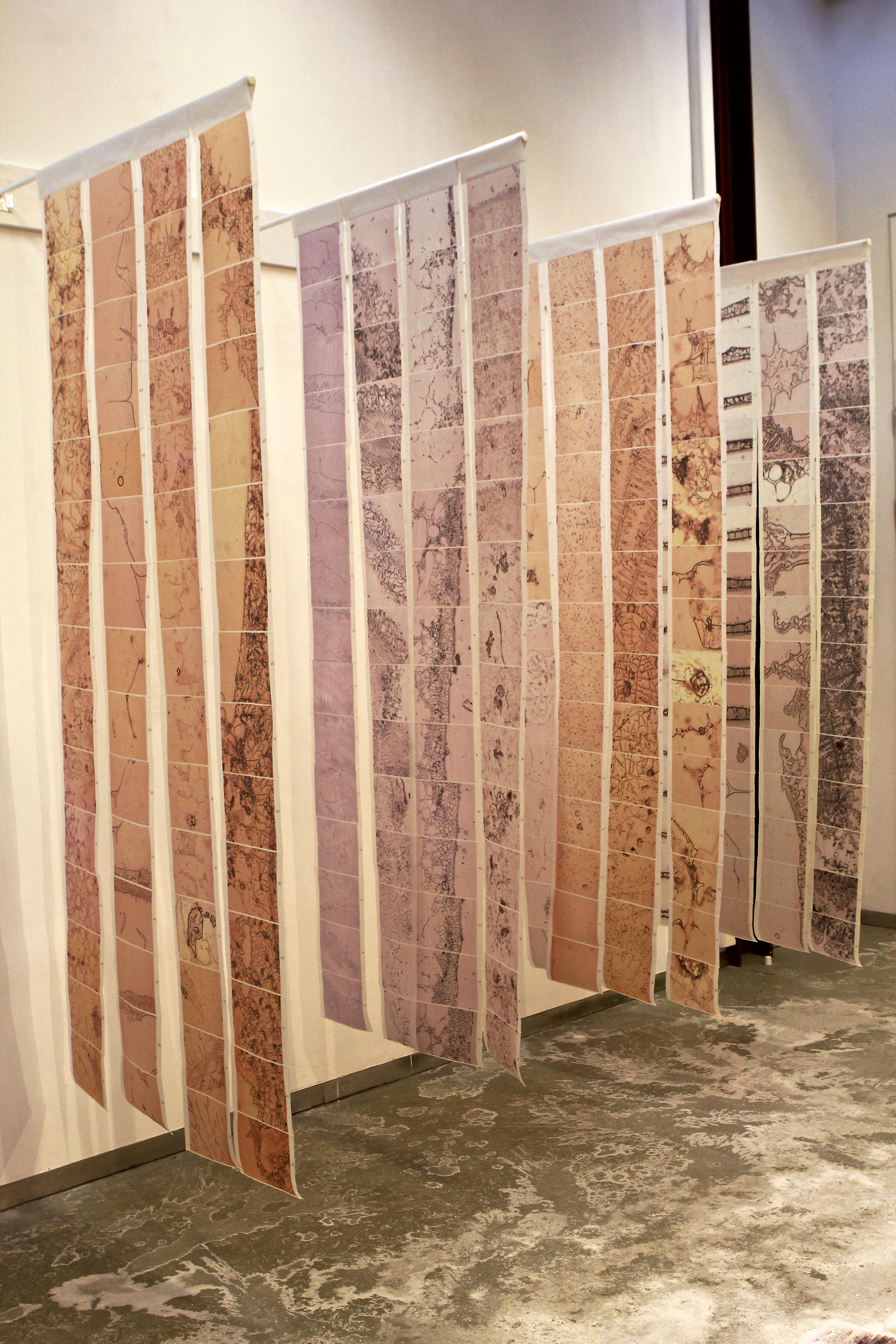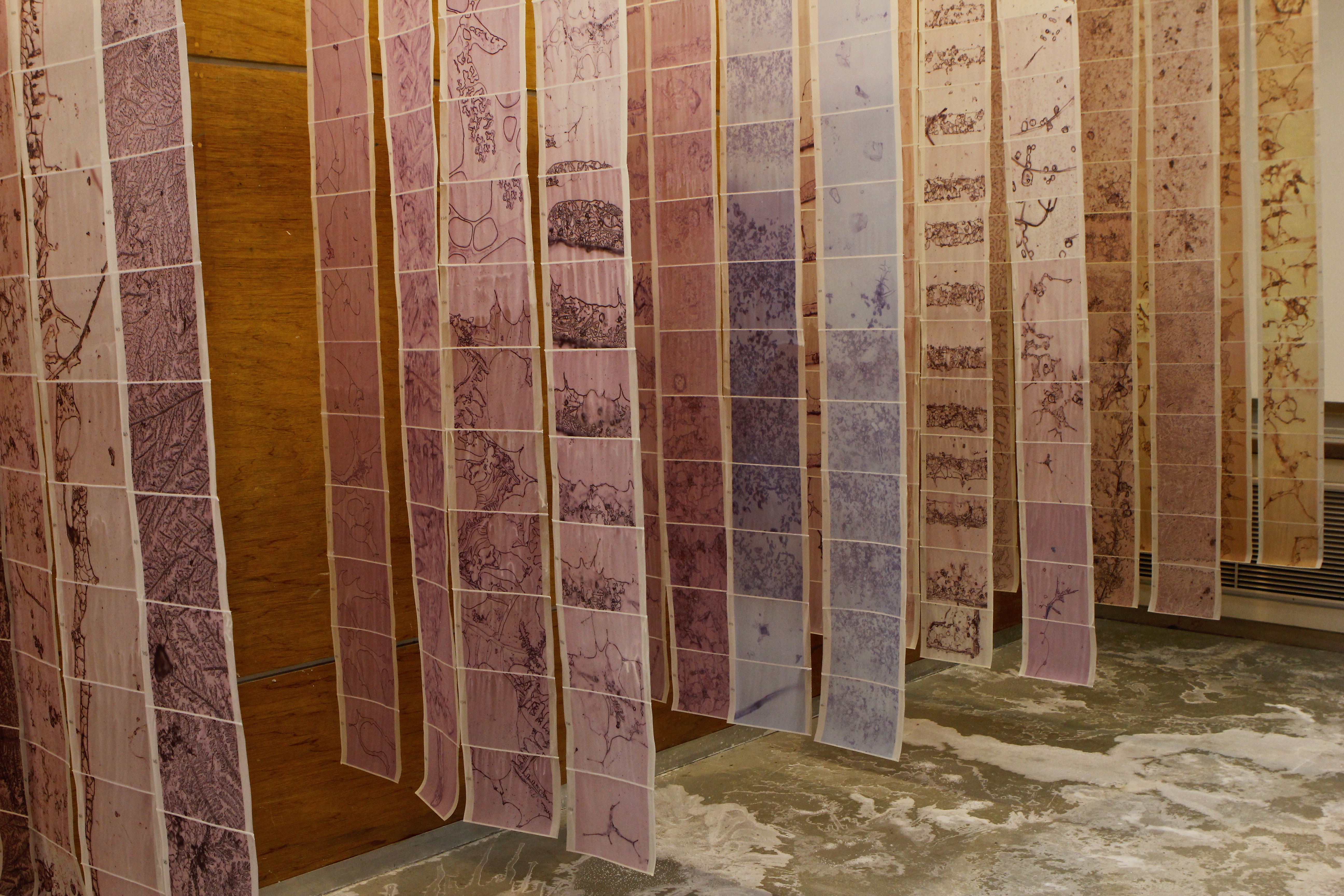 The project is an installation in the laboratory space at the MET. It consists of twelve drapes of photographs of tears under a microscope, plates of salt with hidden tear samples in them, salt on the floor, and glass boxes containing test tubes with photographs of tears. My alternative file emphasizes the fragment. It is a combination of diverse emotions of different people of different identities, at different times. It is an attempt to connect feelings, in an age that moves away from feeling and freezes it. I made use of photographs and on each one of them I wrote with pencil the number of the tear sample I was receiving. I waxed each photograph giving flesh to the intangible evaporated tear, an evidence of an emotions that has ceased to exist.
