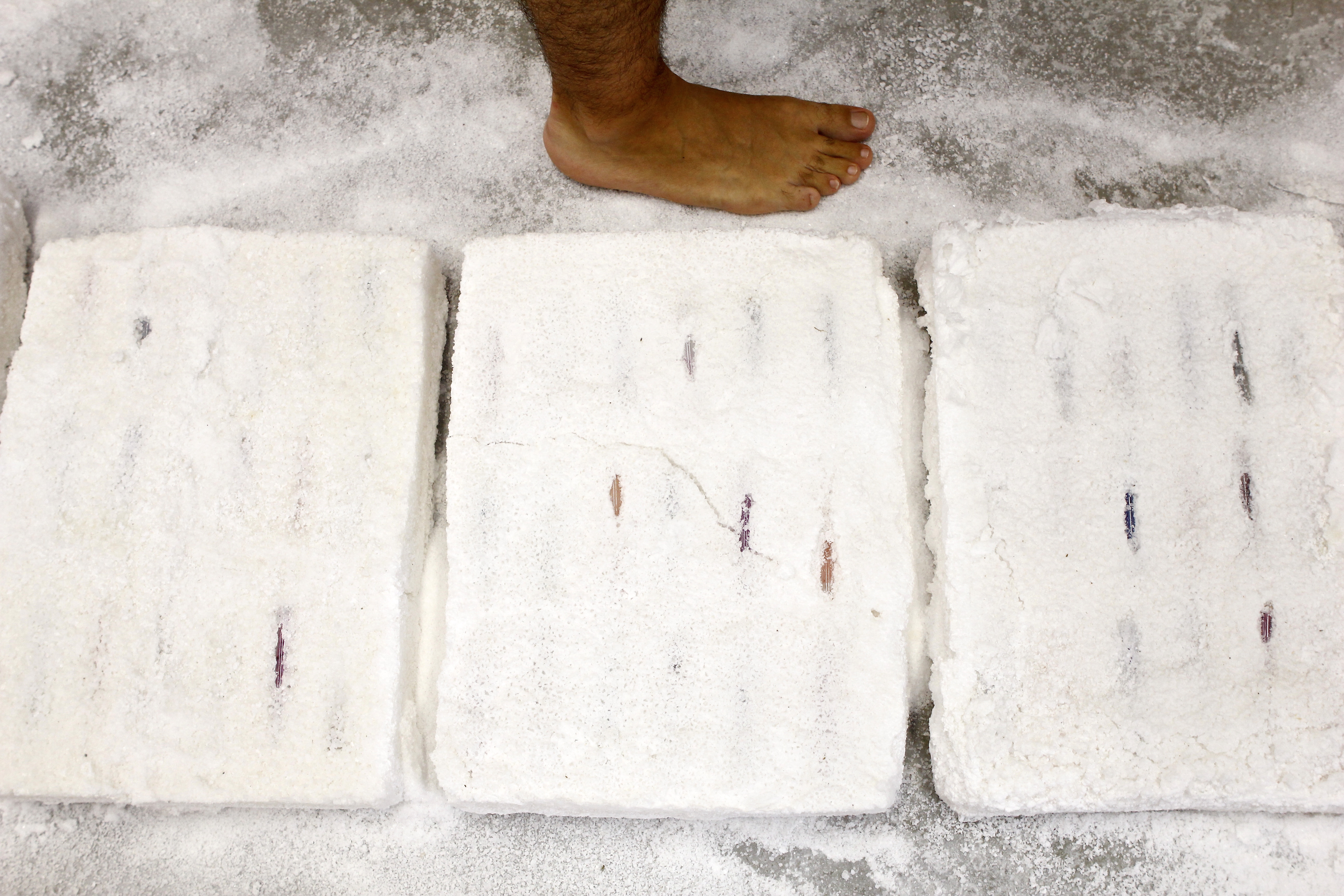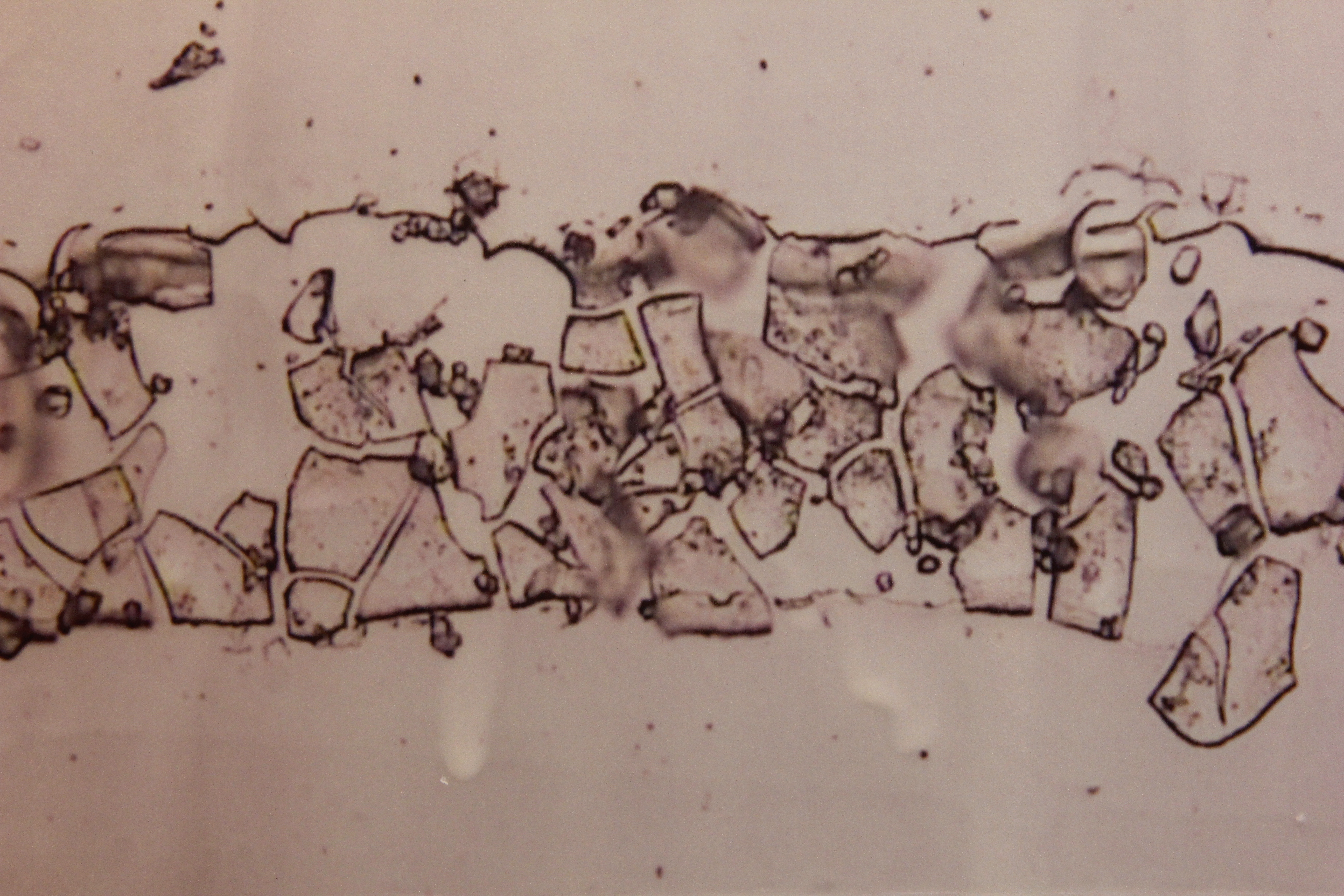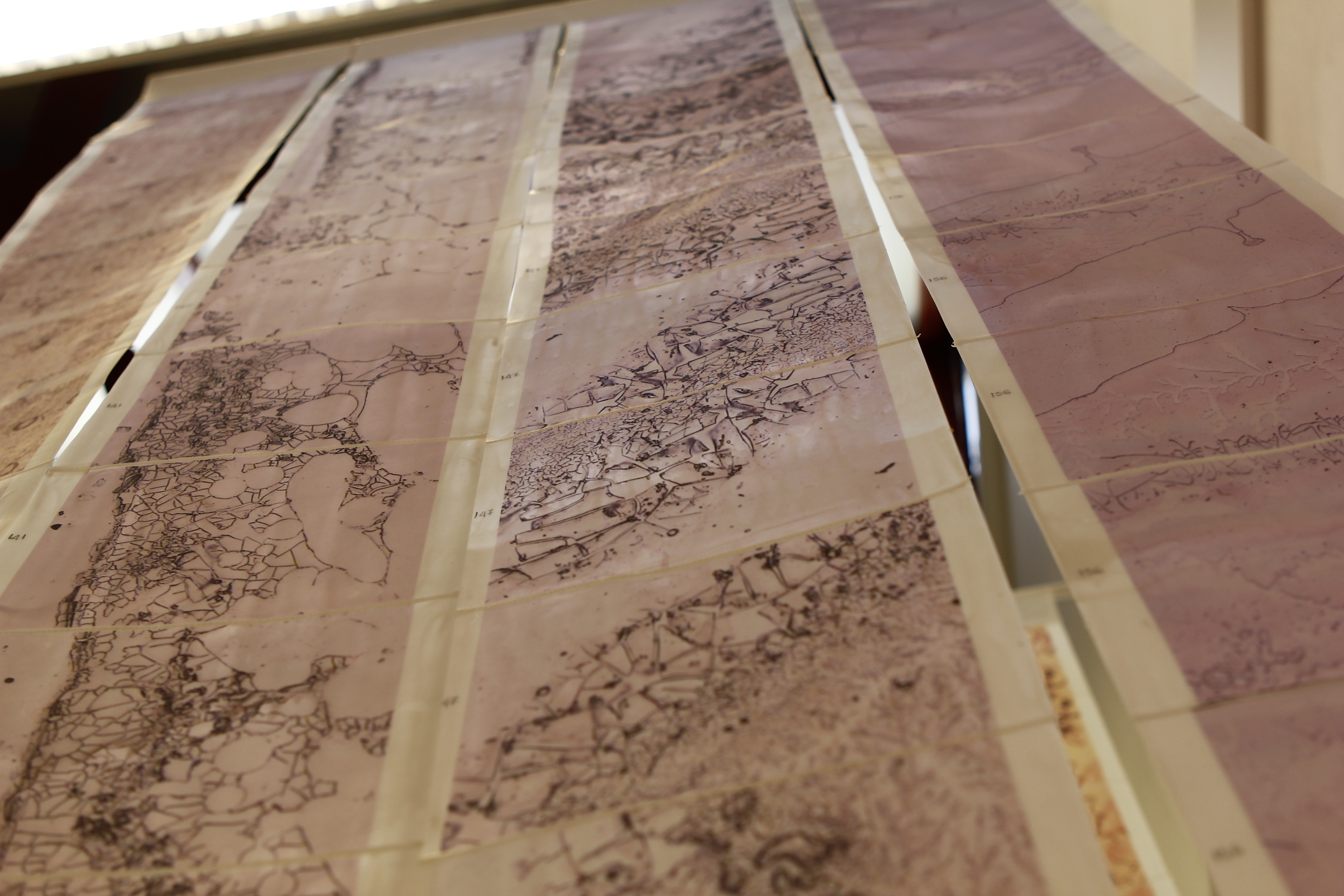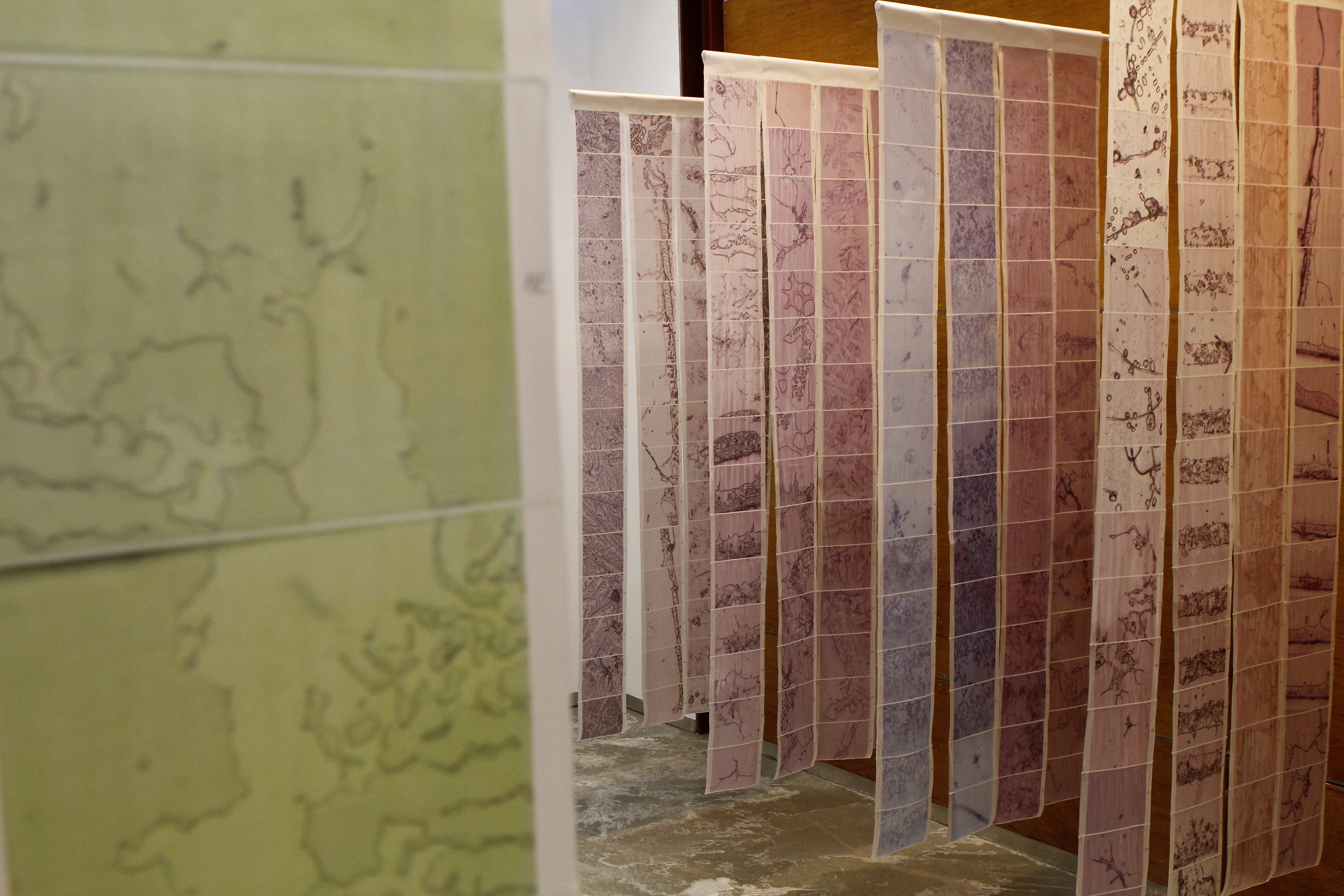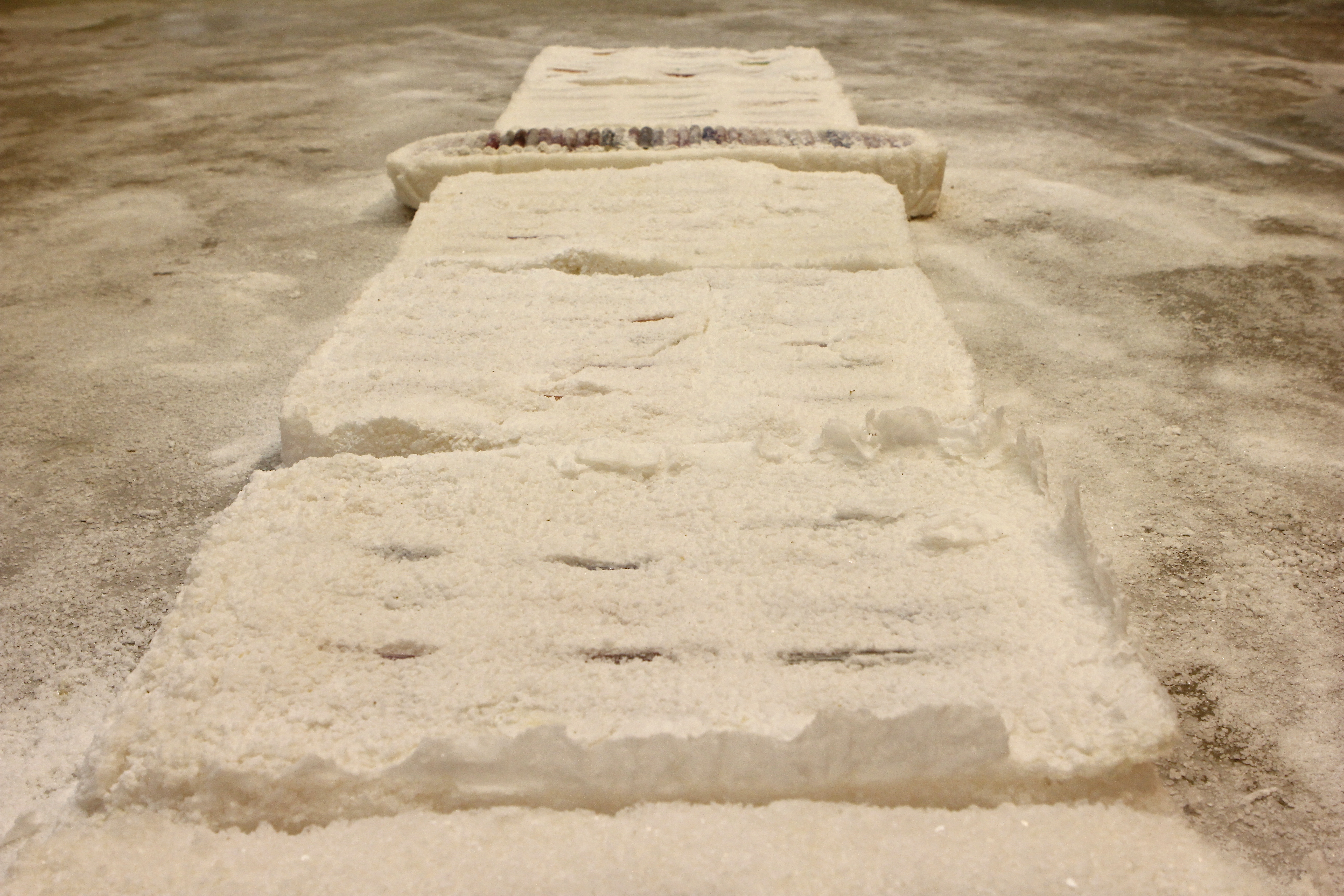 The project is an installation in the laboratory space at the MET. It consists of twelve drapes of photographs of tears under a microscope, plates of salt with hidden tear samples in them, salt on the floor, and glass boxes containing test tubes with photographs of tears. My alternative file emphasizes the fragment. It is a combination of diverse emotions of different people of different identities, at different times. It is an attempt to connect feelings, in an age that moves away from feeling and freezes it. I made use of photographs and on each one of them I wrote with pencil the number of the tear sample I was receiving. I waxed each photograph giving flesh to the intangible evaporated tear, an evidence of an emotions that has ceased to exist.